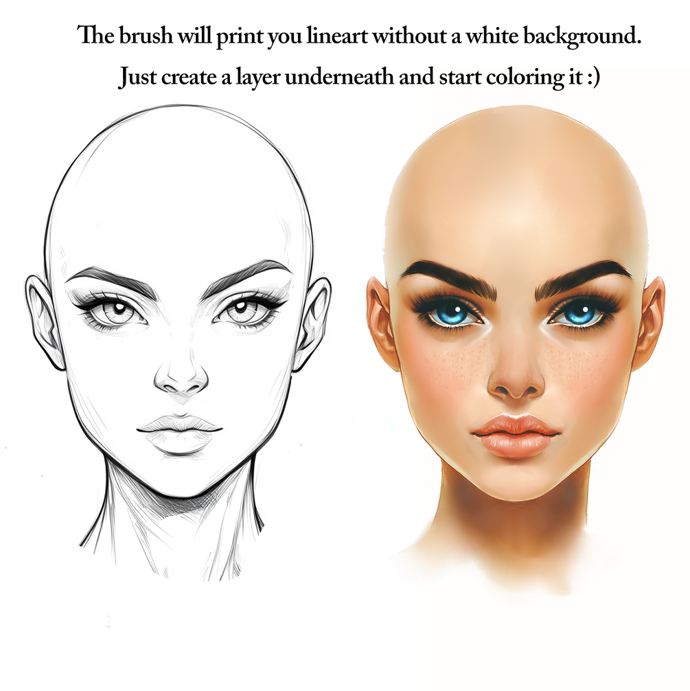 If you want to have fun or practice coloring digital manga this brush bundle is for you! The brush will print you lineart of a manga character's head without a white background. Just create a layer underneath and start coloring it :)